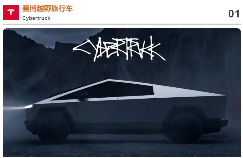 賽博越野旅行車(Cybertruck)是特斯拉旗下的一輛電動皮卡。2019年11月22日,特斯拉首席執行官埃隆?馬斯克(Elon Musk)在美國加州洛杉磯舉辦的活動上發布了該公司第一輛電動皮卡,名為賽博越野旅行車(Cybertruck),其風格與市面上的皮卡完全不同,其靈感來源于1982年科幻電影《銀翼殺手》。