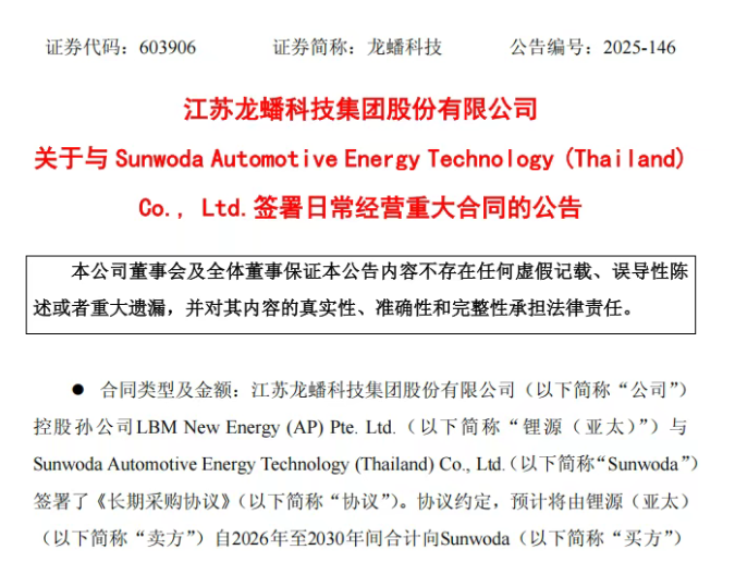 12月2日晚間,龍蟠科技發布公告稱,公司控股孫公司LBM New Energy (AP) Pte.Ltd.(以下簡稱鋰源亞太)簽訂《長期采購協議》,預計銷售金額為45億元至55億元。
