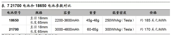 21700電池的能量密度要優于18650電池。根據目前特斯拉披露的信息,在現有條件下,其生產的21700電池系統的能量密度在300Wh/kg左右,比其原來18650電池系統的250Wh/kg約提高20%,容量也將達到4.8Ah左右。