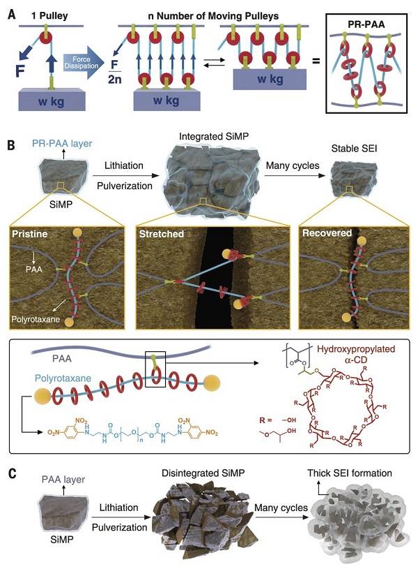 北京時間2017年7月21日,韓國科學技術院(KAIST)的Ali Coskun和 Jang Wook Choi(共同通訊)等人以“Highly elastic binders integrating polyrotaxanes for silicon microparticle anodes in lithium ion batteries”為題在Science上發表文章報道了一種高彈性的粘結劑,通過形成酯鍵使傳統粘結劑PAA與多聚輪烷環組分交聯結合得到具有特殊結構的雙組分PR-PAA粘結劑,很大程度上提高了硅負極在充放電過程中的穩定性。