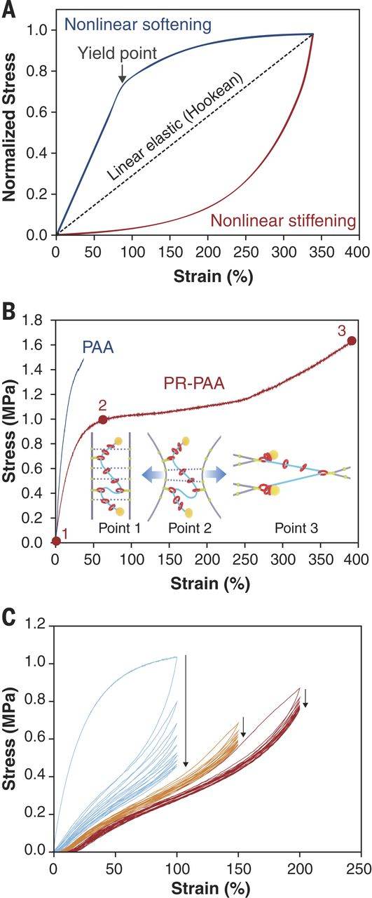 c) 在不同的應變極限下,PR-PAA 10次拉伸-回復循環的應力-應變曲線。