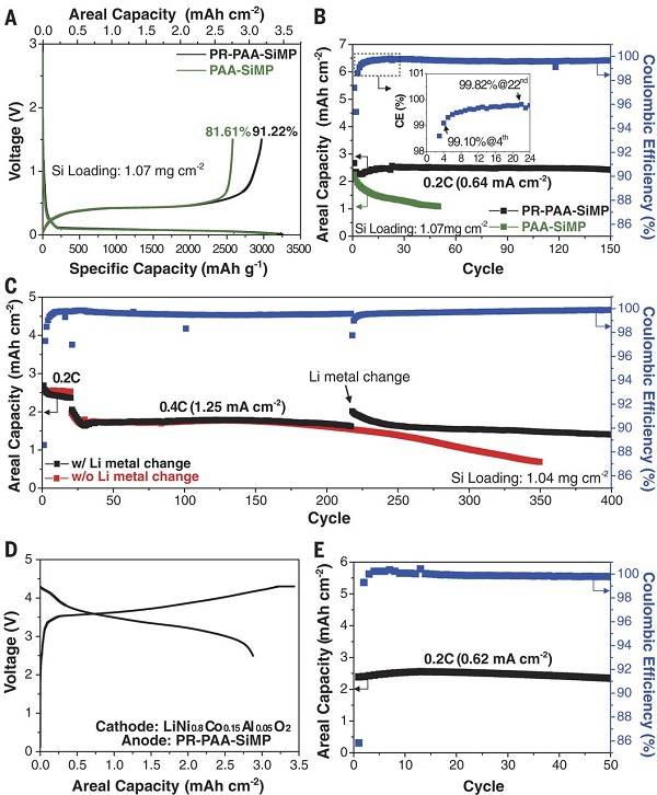圖三 使用PR-PAA和PAA粘結劑的SiMP電極電化學性能