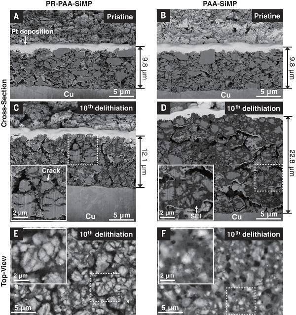 c,d) PR-PAA-SiMP和PAA-SiMP電極循環10圈后的截面SEM圖像;