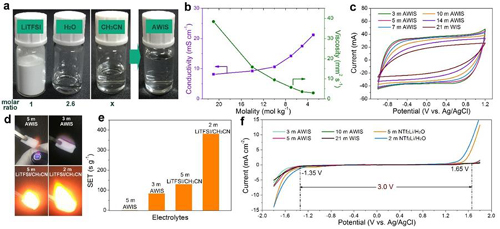 近日,中國科學院蘭州化學物理研究所清潔能源化學與材料實驗室研究員閻興斌團隊開發了一種制備混合電解液的方法。通過向典型的“water in salt”(WIS; 21 m LiTFSI/H2O)電解液加入共溶劑乙腈,制備了“acetonitrile/water in salt”(AWIS)混合電解液。與WIS電解液相比,AWIS混合電解液粘度低、電導率高、應用溫度范圍寬。同時,AWIS混合電解液保持了寬電壓窗口、不可燃和易操作的特點。使用該AWIS混合電解液,研究人員組裝了安全、寬窗口、高倍率的超級電容器。