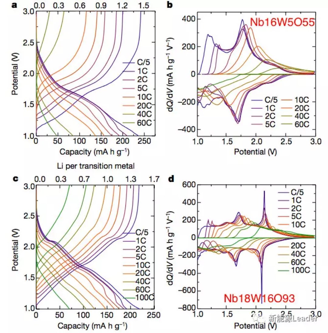 Kent J. Griffith開發的Nb16W5O55和Nb18W16O93兩種材料具有非常高的Li+擴散系數,因此能夠在微米級尺寸上就實現優異的倍率性能,雖然這兩種材料在重量比容量上和電壓平臺上都不如傳統的石墨材料,但是高壓實密度的特性使得兩種材料在體積能量密度上表現出了對石墨材料的壓倒性優勢,在未來快速充電動力電池的研發上,該材料具有廣闊的前景(前提是成本要降下來)。