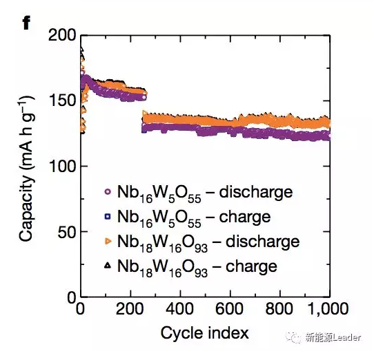 實驗中Kent J. Griffith利用Nb和W的氧化物分別合成了Nb16W5O55(如上圖a-c所示)和Nb18W16O93(如上圖d-f所示),其中Nb16W5O55為單斜晶系結構,晶體中由共角八面體組成,每4x5個八面體組成一個結構單元,如上圖a所示。而Nb18W16O93材料為正交晶系,結構如上圖d所示。兩種材料在不同倍率下的充放電曲線如下圖所示,對于Nb16W5O55材料,在2.5-1.0V之間共有三個反應過程(下圖b),電壓平臺在1.55V左右,與Li4Ti5O12材料(1.55V)比較接近,但是Nb16W5O55材料的可逆容量卻要遠遠高于LTO材料,在C/5倍率下達到225mAh/g,而且Nb16W5O55材料也同樣表現出了優異的倍率性能,將充電倍率提高到5C(12min充滿)可逆容量仍然可以達到171mAh/g,即便是在20C(3min充滿)的高倍率下可逆容量仍然高達148mAh/g。Nb16W5O55材料不僅僅在倍率性能上表現出色,在循環性能上更表現出了強大的實力,在10C倍率下循環250次后可逆容量仍然達到95%,隨后進行20C倍率750次循環后,電池的可逆容量保持率仍然高達95%。