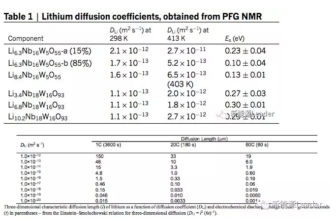 優異的倍率性能主要得益于兩種材料的高Li+擴散系數,從下表中能夠看到兩種材料的Li+的擴散系數為10-12-10-13m2/s左右,這甚至要高于以快速充電著稱的鈦酸鋰類材料(10-16-10-15),對比下表中不同擴散系數在不同倍率下Li+的最大擴散半徑可以看到,在60C倍率下,Nb16W5O55和Nb18W16O93中的Li+完全有足夠的時間在10um直徑的顆粒內完成擴散,這表明即使在微米級尺寸下兩種材料仍然能夠實現超高的充電速度。