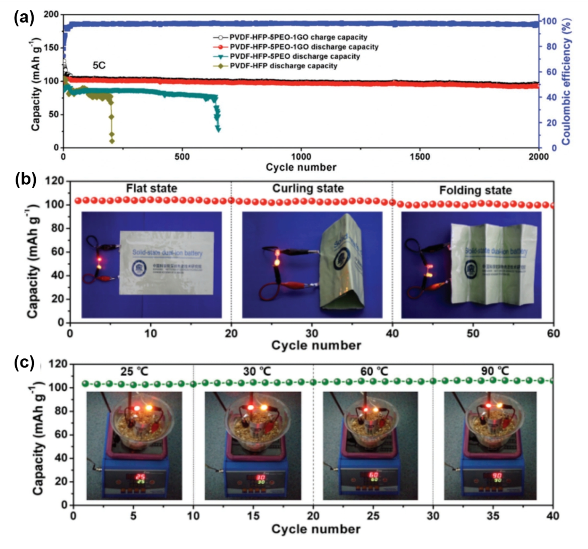 為了解決上述問題,唐永炳及其團隊成員陳光海、張帆等人最近研發出了一種PVDF-HFP、聚氧化乙烯(PEO)與氧化石墨烯(GO)共摻雜的凝膠電解質(簡稱PHPG)。該PHPG共聚物顯示出3D多孔網絡結構,并具有較高的離子電導率(2.1×10-3 S cm-1),從而有利于Li+和PF6-的傳輸。結果表明,基于該凝膠電解質的新型雙離子電池具有優異的倍率性能和循環穩定性:該電池在4.0V的高平均放電電壓下,在倍率為5C時充放電循環2000次后容量保持率高達92%。此外,該電池還具有良好的柔韌性和熱穩定性,在高達90°C的環境下仍可以正常工作。該高效柔性雙離子電池在可穿戴電子設備等領域具有廣闊的應用前景。