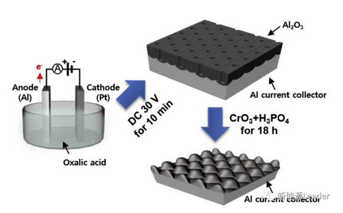 Chang Uk Jeong采用的處理工藝如上圖所示,首先采用30V的恒壓電源Al箔進行電解氧化處理10min,在Al箔的表面形成一層較厚的Al2O3層,然后采用氧化鉻CrO3和H3PO4腐蝕18h,將表面的Al2O3除去,并在Al箔表面形成凹凸不平的表面。