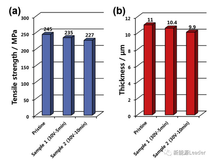 Al箔經過氧化-腐蝕處理后通常會呈現出一定程度的強度降低,下圖a中Chang UkJeong對比了沒有處理的Al箔,30V氧化5min和30V氧化10min的Al箔的抗拉強度,可以看到沒有處理的Al箔的抗拉強度達到245MPa,經過5min氧化處理并腐蝕后的Al箔強度降低到了235MPa,進一步增加氧化處理事件到10min,Al箔的抗拉強度下降到了227MPa,Al箔抗拉強度的下降主要是因為氧化-腐蝕處理工藝破壞了部分Al。這一點可以從Al箔的厚度的變化看出來,從下圖b中能夠看到沒有處理的Al箔厚度為11um,經過5min處理后厚度降低到了10.4um,處理10min后則下降到了9.9um。雖然經過處理后的Al箔強度有所降低,但是227-235MPa的抗拉強度也完全能夠滿足涂布和卷繞過程對Al箔強度的要求。