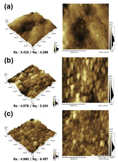 原子力顯微鏡對于材料表面的粗糙度更加敏感,Chang Uk Jeong通過原子力顯微鏡觀察了普通Al箔和經過處理后的Al箔,結果如下圖所示,普通Al箔的表面比較光滑,粗糙度為3.41,經過5min處理后的Al箔的粗糙度增加到4.078,經過10min處理后的Al箔表面粗糙度則進一步提高到了4.98,同時我們能夠從圖中看到經過處理后Al箔表面呈現出了山峰狀突起,正如前面SEM中所觀察到的那樣。