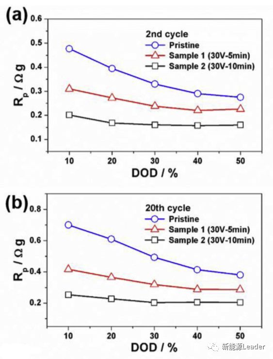 處理后的Al箔倍率性能提升的主要因為接觸電阻的降低,使得在放電過程中電池的極化降低,下圖對比了在第2次循環和第20次循環中電池的極化電阻和放電深度之間的關系,從圖中能夠看到普通Al箔的極化電阻最大,經過5min處理后的Al箔極化電阻稍低,經過10min處理的Al箔極化電阻最低,這與前面的倍率測試結果相一致。