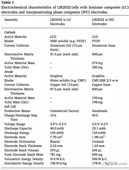 下表中作者對(duì)比了普通商業(yè)2032型扣式電池和泡沫集流體2032扣式電池的電性能,從表中我們?cè)谥亓磕芰棵芏壬掀胀ㄉ虡I(yè)2032扣式電池更加具有優(yōu)勢(shì),大約比泡沫集流體電池高11%,但是從體積能量密度上看,泡沫集流體電池則扳回一城,比商業(yè)2032扣式電池高22%。