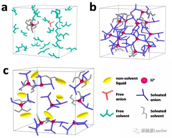 在稀溶液(如上圖a)中,一個Li+會與多個溶劑分子(一般是4到6個)發生溶劑化,陰離子和剩余的溶劑分子是自由移動的,而在高濃度溶液(如上圖b所示),幾乎所有的溶劑分子都參與到Li+的溶劑化之中,并且陰離子也參與到了溶劑化的過程之中,與Li+的強相互作用使得溶劑分子與陰離子的電子濃度降低,因此使得溶劑分子和陰離子的氧化還原活性降低,增加了電解液的電化學窗口寬度,但是高濃度的LiTFSI溶液卻會導致電解液的電導率降低、粘度升高、對隔膜和電極的浸潤性下降,Li+的遷移數降低,不利于電性能的提升。因此理想的電解液應該是Li+與溶劑分子形成穩定的溶劑化外殼,但是Li+溶劑化外殼之間不會形成相互連接的3D結構(如上圖b所示),使得電解液在保持寬的電化學穩定窗口的同時,也能夠保持低粘度,高電導率。基于上述觀點,Guoqiang Ma通過在高濃度電解液中引入非溶劑液體,打破原有的相互連接的3D結構Li+溶劑化外殼,但又不破壞單個Li+溶劑化外殼結構,因此在保證良好的電化學穩定性的同時,又提升了電解液的電導率。