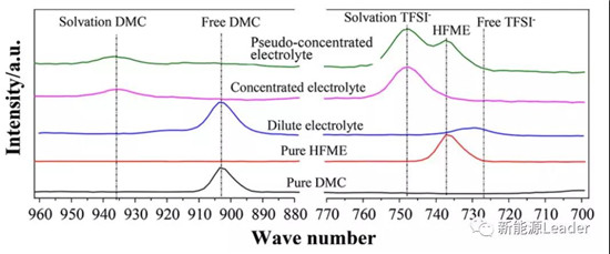 采用拉曼光譜對電解液的結構研究顯示,在低濃度電解液中大多數的DMC溶劑分子為自由分子的狀態,而在高濃度電解液中所有的DMC分子都與Li+相互作用形成溶劑化外殼,同時自由狀態的TFSI-也消失了,表明TFSI-也參與到了Li+溶劑化過程中。而局部稀釋電解液的拉曼光譜與高濃度電解液幾乎相同,僅僅是在737/cm出現了MFME的鍵,這表明MFME的添加并沒有改變原有的電解液中Li+的溶劑化結構,使得局部稀釋電解液保持了良好的電化學穩定特性,同時MFME的加入打破了相互連接在一起的Li+溶劑化結構,提高了電解液的電導率。