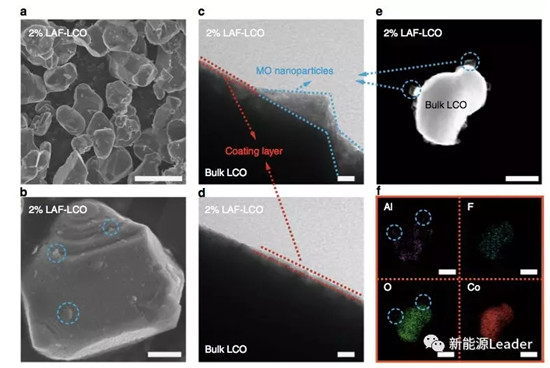 試驗中得到的LAF-LCO材料的掃描透射電鏡和掃描電鏡圖片如下圖所示,從圖中能夠看到表面包覆層的厚度在7nm左右,超薄的包覆層能夠允許Li+快速擴散通過包覆層,避免對LCO材料的倍率性能產生影響。同時也能夠觀察到在LCO顆粒的表面還存在一些直徑較大的顆粒(晶粒尺寸在60-100nm),EDS分析表明這些顆粒主要成分為Al和O,沒有Co和F元素。