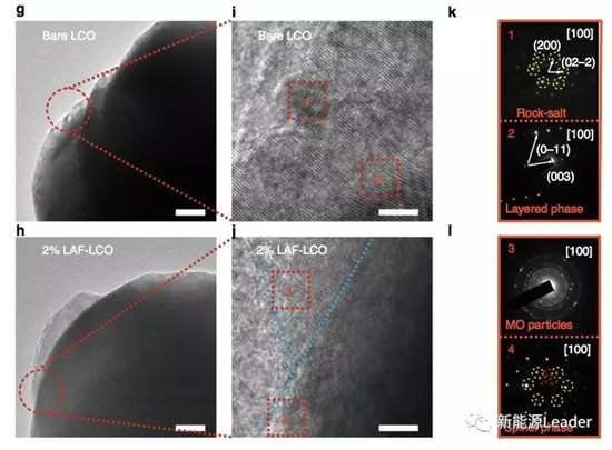 通過透射電鏡對LCO和LAF-LCO結構進行分析發現,在普通的LCO材料中同時存在層狀結構和巖鹽結構相,巖鹽結構的產生主要是因為LCO顆粒表面接觸空氣和水分生成Li2CO3和LiOH,從而產生了貧Li區域。而經過包覆處理后的LCO材料則展現出了復雜的晶體結構特點,下圖J的3區域(包覆層上的顆粒)中存在Al2O3和LiAlO2兩種物相。而在區域4(LCO顆粒的表面)則是均勻的尖晶石相,這主要是因為在熱處理的過程中Li、Al、F向LCO顆粒內部擴散形成了摻雜相。