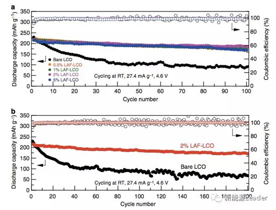 下圖為不同LAF含量的LCO材料與沒有包覆層處理的LCO材料的循環性能曲線(3.0-4.6V,電流密度27.4mA/g),從圖a中能夠看到無論LAF包覆層的比例多少,其循環性能都要好于沒有經過包覆處理的LCO材料,其中包覆量為2%的LAF-LCO材料循環性能最好,循環100次后容量保持率達到了89.1%(185.3mAh/g),循環200次容量保持率仍然可達81.8%(170.7mAh/g)。而包覆量分別為0.5%、1%和5%,以及沒有包覆的LCO材料循環100次后的容量保持率分別為77.6%、81%和81.6%和44.5%。表明LAF包覆能夠顯著的改善LCO在高截止電壓下的循環穩定性。