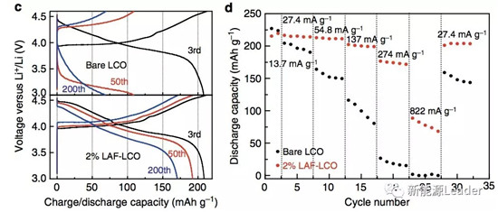 從下圖c中能夠看到沒有包覆處理的LCO材料的首次放電容量為229.8mAh/g,要高于2%包覆量的LAF-LCO材料的216.2mAh/g,但是在經過兩個周期循環后兩者的放電容量就變的非常接近(未包覆LCO材料208.1mAh/g,2%LAF-LCO材料208.6mAh/g)。放電的過程中LCO材料兩個電壓平臺,分別位于4.41V和3.81V,其中4.41V附近的短平臺主要是H1-3相轉變為O3相,3.81V附近的長電壓平臺則主要是兩個O3相之間的轉變。從下圖c中能夠看到經過50次循環后沒有包覆處理的LCO材料在4.41V附近的電壓平臺消失了,表明LCO材料已經發生了不可逆相變,而2%LAF包覆的LAF-LCO材料則在經過200次循環后仍然能夠看到4.41V附近的電壓平臺。