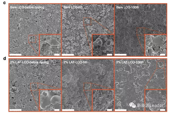 為了驗證表面包覆層對LCO材料倍率性能的影響,作者還對未包覆LCO和2%LAF包覆LCO材料的倍率性能進行了測試,測試結果如下圖d所示,從圖中能夠看到無論是在容量發揮,還是在循環穩定性上2%表面包覆的LAF-LCO材料的性能都要好于未包覆的LCO材料,這主要是因為LAF包覆層的厚度僅為7nm對Li+的擴散沒有影響,并且也避免普通LCO材料表面容易產生的低電導率Li2CO3和LiOH等雜質,從而顯著提升了LCO材料的倍率性能。