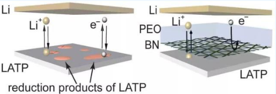 (圖示)左圖顯示接觸到鋰金屬的磷酸鋁鈦鋰(LATP)顆粒會立即被還原,鋰與固體電解質之間嚴重的副反應會使電池在幾個周期內發生故障。右邊顯示的是一種人造氮化硼薄膜,它在化學和機械上都能抵抗鋰。它通過電子方式將LATP與鋰隔離,但當被聚乙烯氧化物(PEO)滲透時,仍能提供穩定的離子通道,從而實現穩定的循環。圖片:Qian Cheng/Columbia Engineering