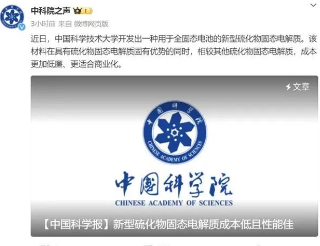 據中科院之聲微博官宣,中國科學技術大學開發出一種用于全固態電池的新型硫化物固態電解質,該材料在具有硫化物固態電解質固有優勢的同時,相較其他硫化物固態電解…