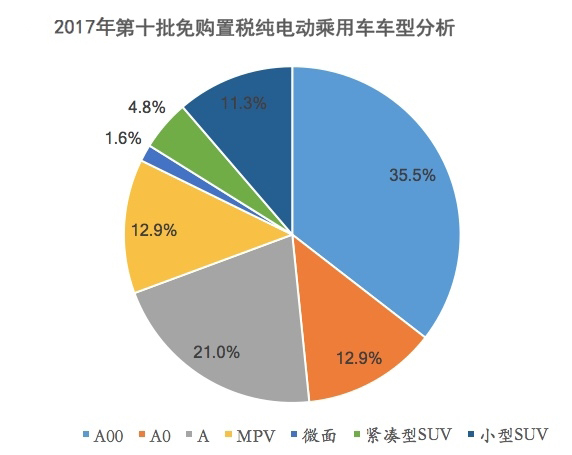 第十批免購置稅的純電動乘用車依然是以A00級微型車為主,A級緊湊型乘用車緊跟其后,其次是A0級小型車和MPV車型;SUV車型占比較少并且以微小型SUV為主;并未出現中大尺寸的轎車或SUV車型。