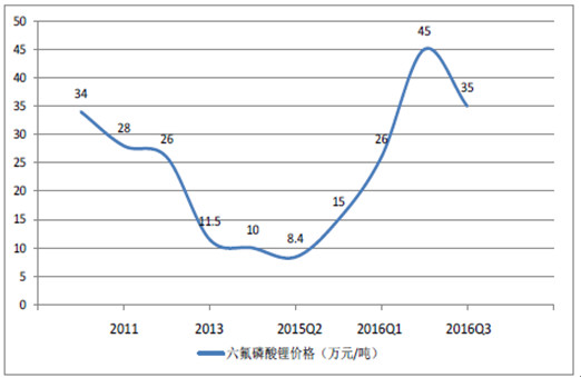 首先,據相關數據統計,從2016年第三季度以來,六氟磷酸鋰價格已從45萬元/噸的高位價格回落至34萬元/噸左右,降幅超過20%,目前來看,2017年將繼續保持降價的大趨勢。