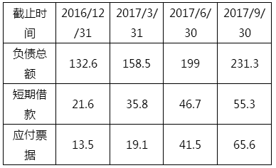 沃特瑪自2014年加快擴產(chǎn)步伐,在銅陵、十堰、荊州、唐山、渭南等地建設(shè)生產(chǎn)基地,產(chǎn)能也從2014年的近4GWh迅速擴大到2017年的近20GWh。大躍進發(fā)展的背后,沃特瑪的債臺高企。可以看出,支撐沃特瑪在過去兩年飛速發(fā)展的基礎(chǔ)是迅猛增長的債務(wù)尤其是短期借款。如表1所示: