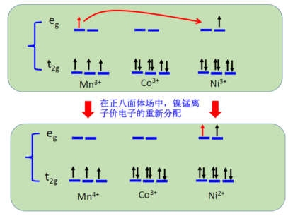 在Ohzuku教授發表了關于用LiNi1/3Co1/3Mn1/3O2作為鈷酸鋰的替代材料的雄文后的幾年時間里,日本韓國及新加坡的研究人員先后通過第一性原理模擬計算、X射線近邊吸收等手段證實三種過渡金屬在LiNi1/3Co1/3Mn1/3O2中氧八面體晶體場中發生了不同的能級分裂,為了達到系統能量最低,鎳錳通過離域化進行了了電子的重新分配,分別形成高自旋態的Mn4+(t2g3 eg0)和Ni2+(t2g6 eg2),鈷則保持原有的低自旋態Co3+(t2g6 eg0)。