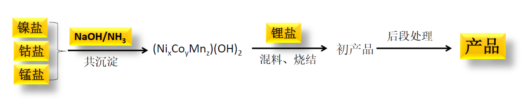 從鈷酸鋰到三元已經不是單純的鈷鋰兩種原料的反應,而是鎳鈷錳鋰四種原料的反應,為了達到更好的物料混合均勻效果,一般是將鎳鈷錳首先通過共沉淀的方式形成前驅物(復合氫氧化物),在將前驅物與鋰鹽混合后進行燒結,下圖顯示了三元材料的一般生產流程: