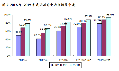 2019年以來,我國動力電池市場集中度[ :本段中動力電池市場集中度是指動力電池裝機量市場集中度,按照各大動力電池企業裝機量計算得來。]進一步向寧德時代、比亞迪兩家龍頭企業集中。2019年上半年,我國動力電池市場CR2、CR5 和CR10 分別為70.7%、80.4%和87.9%,分別較2018年提高了8.8、6.9和5.3個百分點。