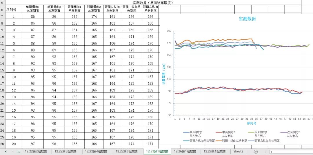技術指標方面,SDC涂布機所能達到高要求的參數數據,遠遠超越普通涂布水準。單面厚度誤差≤±1.5μm;雙面厚度誤差≤±2μm;涂布面密度≤±1.0%;在1200mm涂寬狀態下,涂布速度高達70m/min等等。