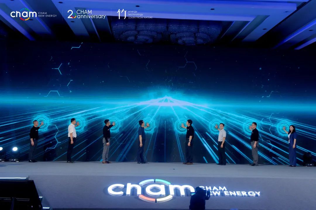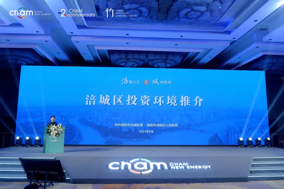 隨著涪城區委書記鄧輝,涪城區委副書記、政府區長張虛懷,四川綿陽工業園區管委會主任黃維,涪城區副區長陳洪芳,以及創明新能源董事長孟致成,創明CEO 熊立,創明副總裁謝冬生,創明副總裁陳國新一同登臺,共同按下啟動鍵,共同見證竹藤電池新品的正式發布。