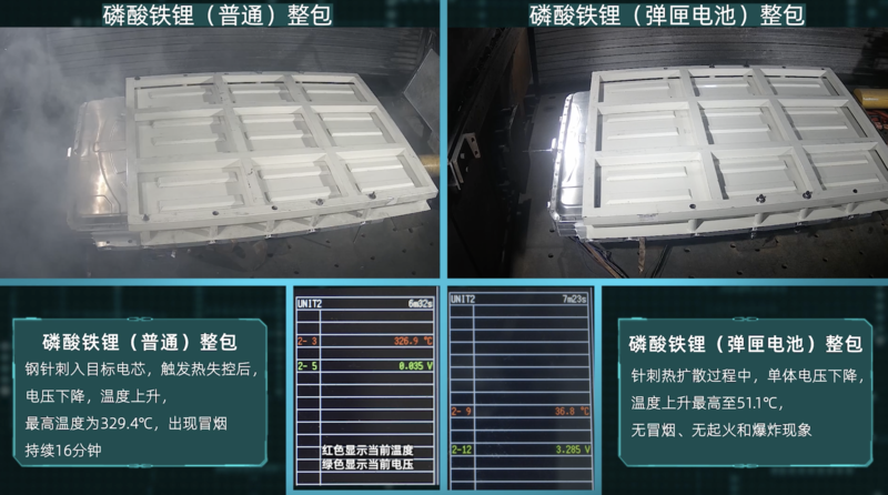 從試驗(yàn)結(jié)果來(lái)看,搭載彈匣電池系統(tǒng)安全技術(shù)的磷酸鐵鋰整包針刺相對(duì)普通整包,不冒煙且溫度僅為51.1℃,是目前針刺熱失控實(shí)驗(yàn)中表現(xiàn)最優(yōu)的動(dòng)力電池,刷新了磷酸鐵鋰電池的安全新高度。