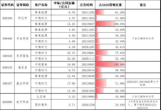 記者梳理相關上市公司公告發現,在公布鋰電設備業務中標或重大合同的相關公告中,2021年公告數量較之2020年顯著上升,且2020年的公告多集中在10月-12月。同時從公布的金額來看,相關公司2021年中標金額顯著上升,其中海目星(688559.SH)單次中標中航鋰電的金額已達2020年全年營收的148.98%。