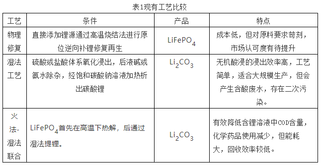 廢舊磷酸鐵鋰正極材料的物理修復(fù)再生方法是指LiFePO4直接添加鋰源通過高溫?zé)Y(jié)法進(jìn)行原位逆向補鋰修復(fù)再生;容量衰減、表面晶體結(jié)構(gòu)發(fā)生改變的正極材料加入還原劑的低溫含Li溶液中補鋰,之后經(jīng)過退火直接再生新的LiFePO4,該方法對原料要求高,且修復(fù)產(chǎn)品沒有相應(yīng)的產(chǎn)品標(biāo)準(zhǔn),市場認(rèn)可度有待提升。