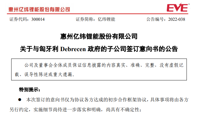 億緯鋰能(300014.SZ)官宣將在匈牙利新建動力電池生產(chǎn)基地。