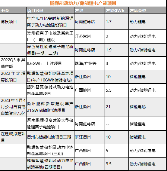 鵬輝能源當前的動力/儲能鋰電產能項目如下圖所示: